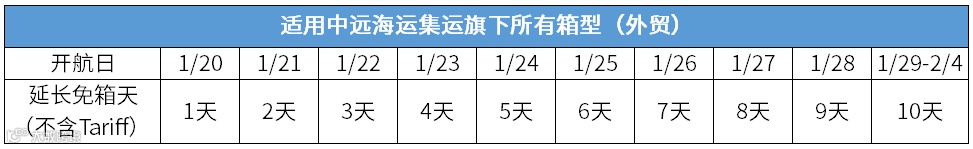注:所有中国大陆地区出口订舱在1月20日-2月4日期间开航的货物(外贸),都将享有上述额外延长出口免箱期(不含堆存及冷插费用),并不会产生额外的滞箱费用