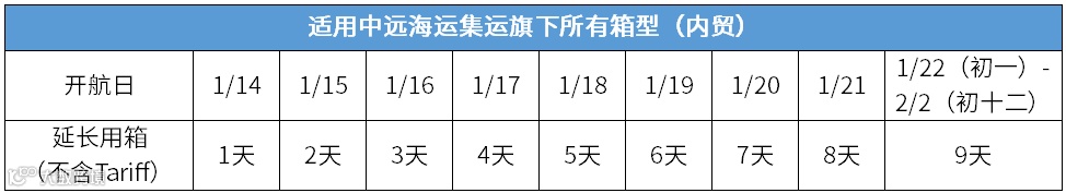 注:所有中国大陆地区(内贸)在1月14日-2月2日期间出口开航的货物,都将享有上述额外延长出口免箱期(不含堆存及冷插费用),并不会产生额外的滞期费用
