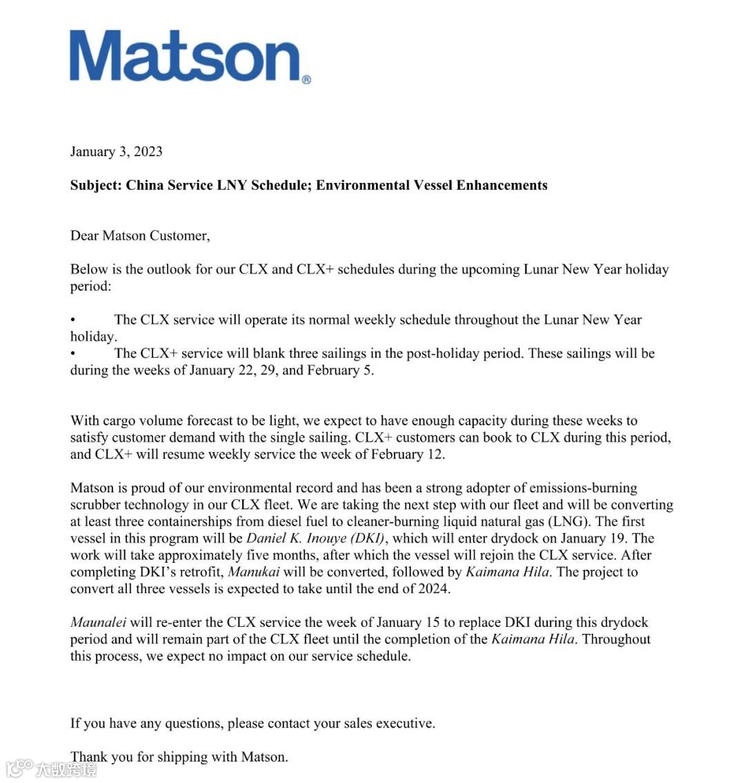 美森预计春节期间CLX一条航线完全能满足因为假期而减少的货量需求。CLX+的客户在此期间可以订舱CLX直至2月12日CLX+恢复周班服务。