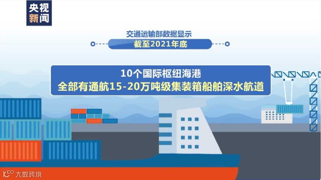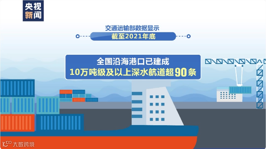 数据显示,截至2021年底,全国沿海港口已建成10万吨级及以上深水航道超90条,10个国际枢纽海港全部有通航15—20万吨级集装箱船舶深水航道;大连、唐山、青岛、宁波舟山、湛江、湄洲湾等港口已具有通航40万吨散货船舶的深水航道。