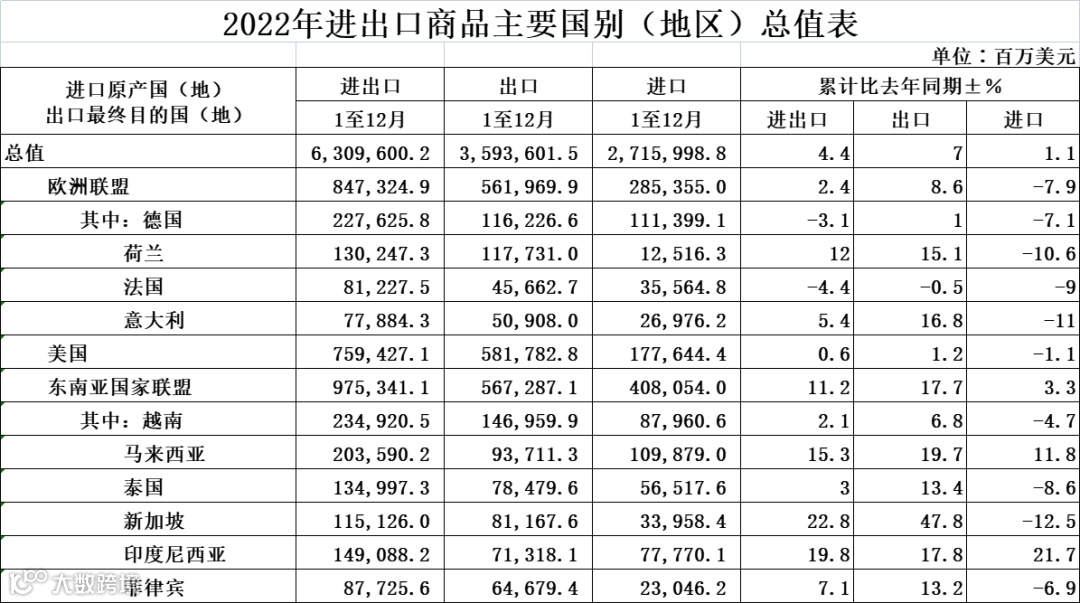 从市场看,2022年我国对东盟、欧盟等主要贸易伙伴的出口都保持较快增长;新兴市场加速开拓,对“一带一路”沿线国家出口增长20%,拉动整体出口增长6.1个百分点,对非洲、拉丁美洲出口分别增长14.8%、14.1%。