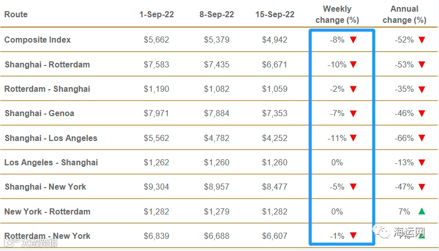 上海-鹿特丹的现货运价下跌10%即764美元至6671美元/FEU。