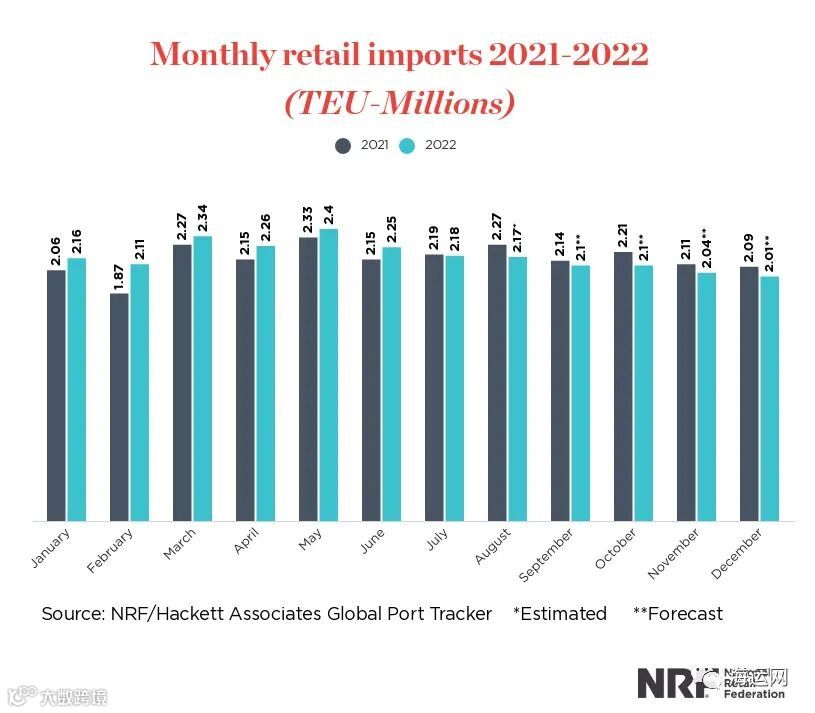 NRF的最新数据显示,自5月以来,进口量逐月下降。但即使需求放缓,预计第四季度的进口量仍将高于2019年同期,2022年的进口总量可能比2021年增长1.2%,并创下新的年度记录。