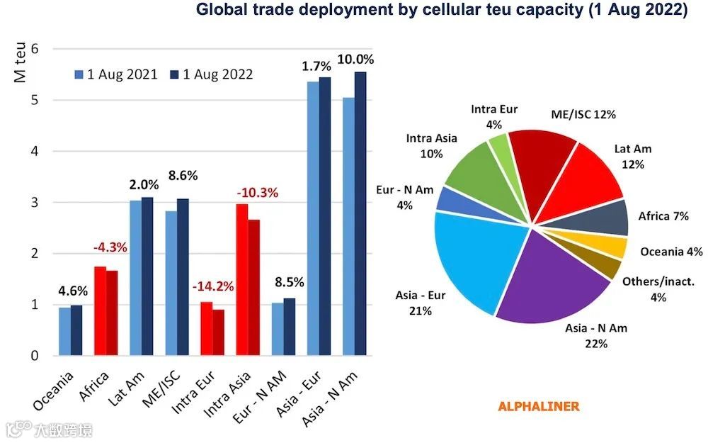 Alphaliner的报告指出,特别是亚洲和北美之间的运输,消耗了欧洲、亚洲和非洲的内部航线运力。然而,情况比这要微妙得多。