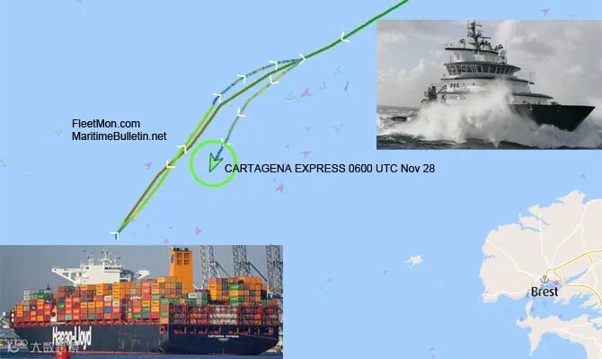 救援船“Abeille Bourbon”回应,集装箱船“CARTAGENA EXPRESS”将被拖至布雷斯特港(Brest),该拖船于11月27日下午开始拖航,预计11月29日到达。