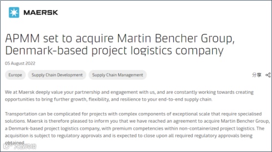 8月5日,马士基在官网宣布,已达成协议,收购总部位于丹麦的项目物流公司Martin Bencher Group。该交易的企业价值为6100万美元。