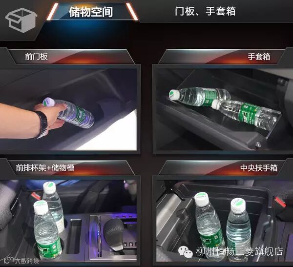 三菱新款帕杰罗的储物空间表现中规中矩,前排中央扶手区域拥有丰富的储物空间,包含一个正方形储物阁和前排杯架,其中正方形储物阁纵深超过矿泉水瓶的高度,可以轻松将茶杯等物品工整地放置其中;前排杯架则连接在一起,杯架前方是长方形储物槽,可以放置数据线、U盘等需要随时提取使用的物品。