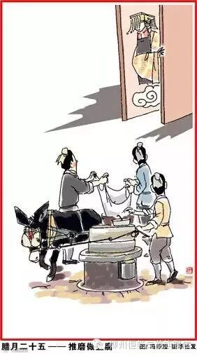 腊月二十五,推磨做豆腐。传说玉帝会下界查访,吃豆腐渣以表清苦。