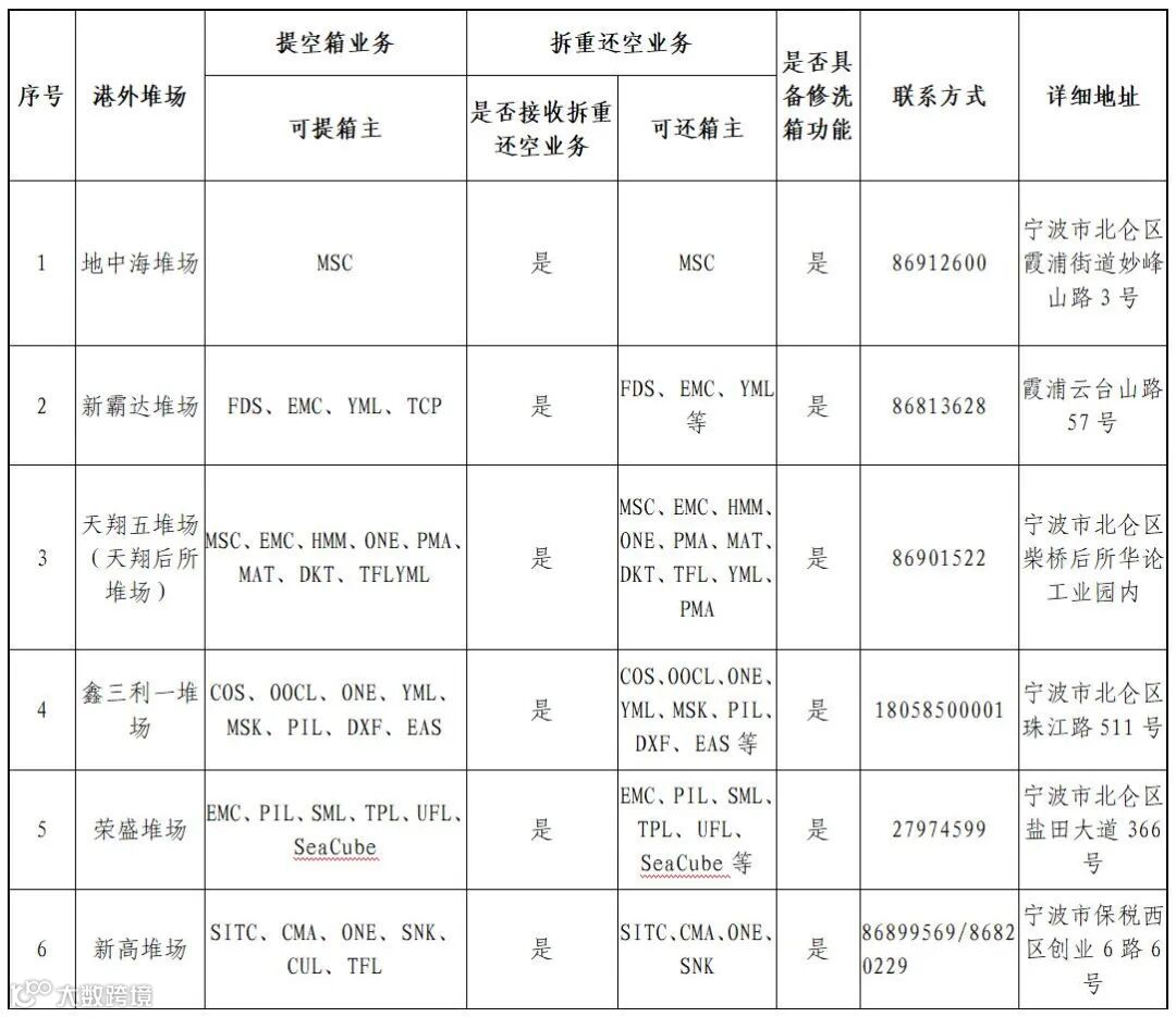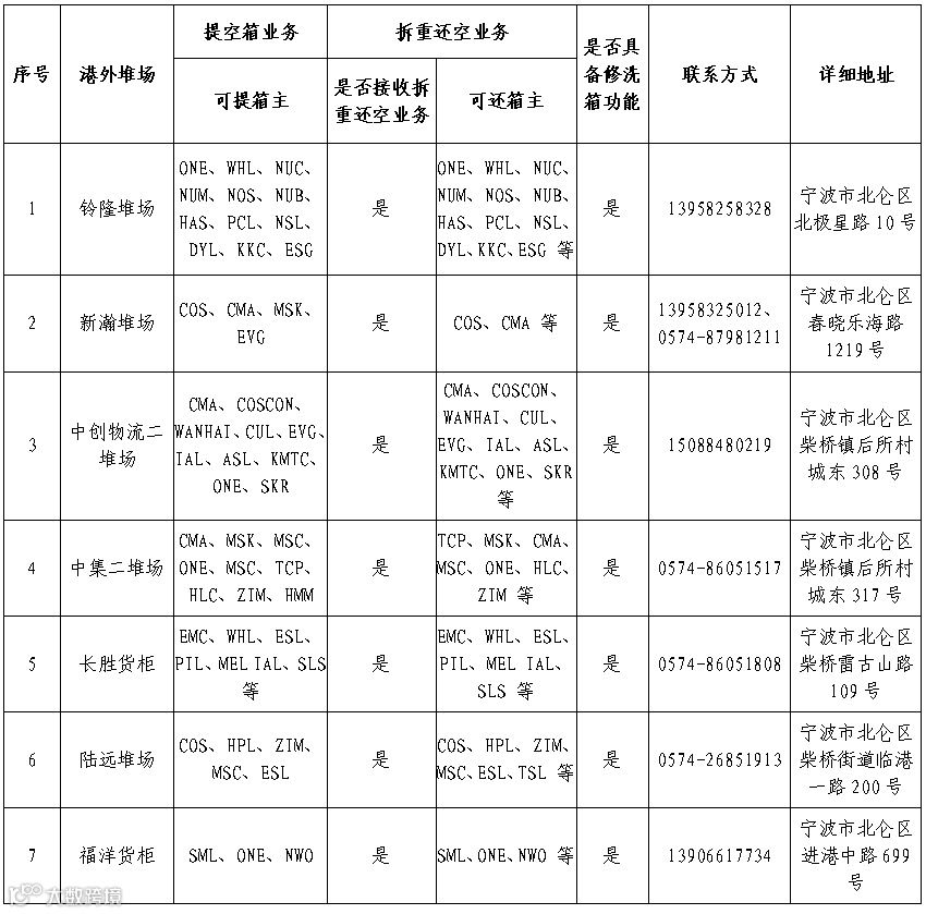宁波港域第一批开放堆场分别为天翔二、天翔八、珉钧一、东华一和新世纪堆场,同时也汇总了南北两翼和义乌“第六港区”的提还箱站点信息,请详见“附件1”。鉴于当前各堆场提还箱业务较为繁忙,广大客户若有新增需求,请提前与各个堆场相关负责人联系。