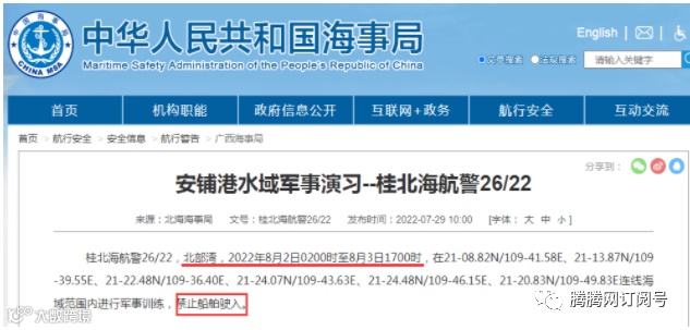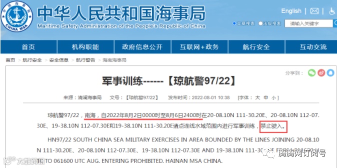 据海南海事局 :琼航警97/22,南海,据海南海事局 :琼航警97/22,南海,自2022年8月2日0000时至8月6日2400时在20-08.10N 111-30.20E、20-08.10N 112-07.30E、19-38.10N 112-07.30E和19-38.10N 111-30.20E诸点连线水域范围内进行军事训练,禁止驶入。