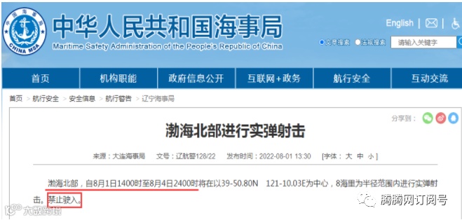 据大连海事局 :渤海北部,自8月1日1400时至8月4日2400时将在以39-50.80N 121-10.03E为中心,8海里为半径范围内进行实弹射击。禁止驶入。