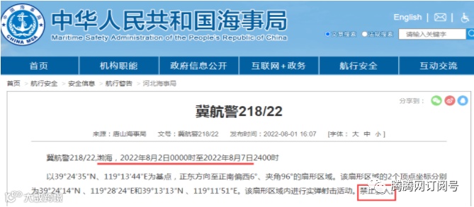 据河北海事局 :渤海,2022年8月2日0000时至2022年8月7日2400时,以39°24′35″N、119°13′44″E为基点,正东方向至正南偏西6°、夹角96°的扇形区域。该扇形区域的2个顶点坐标分别为39°24′14″N 、119°28′24″E和39°13′13″N 、119°11′51″E。该扇形区域内进行实弹射击活动。禁止驶入。