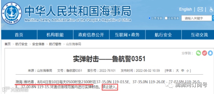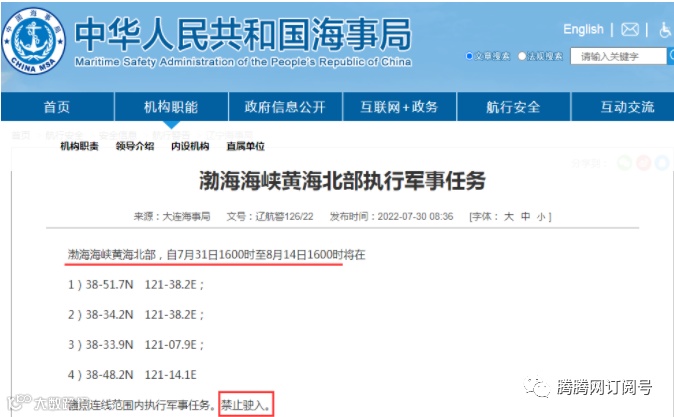 据大连海事局 :渤海海峡黄海北部,自7月31日1600时至8月14日1600时将在