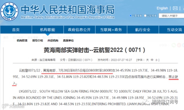 据连云港海事局 :黄海南部,7月28日至8月5日每日0800时至1800时在34-45.95N 119-19.73E、34-49.98N 119-18.95E、34-52.69N 119-20.31E、34-51.86N 119-23.82E和34-48.53N 119-23.55E四点连线范围内进行实弹射击,禁止驶入。