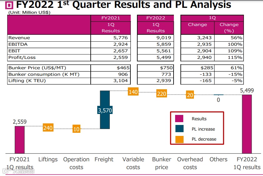 此外,欧洲包括汉堡等港口的拥堵仍在继续。总的来说,尽管集运市场供需紧张的基本面有所缓和,但运价仍保持稳定并显著高于去年同期,ONE2022财年第一季度业绩创历史新高。