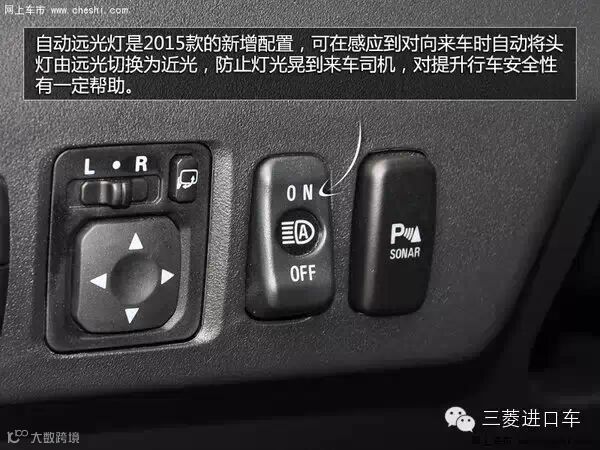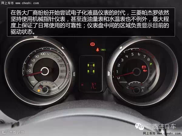 在各大厂商纷纷开始尝试电子化液晶仪表的时代,三菱帕杰罗依然坚持使用机械指针仪表,甚至连油量表和水温表也不例外,最大程度上保证了日常使用的可靠性;仪表盘中间的区域负责显示目前的驱动状态。自动远光灯是2015款的新增配置,可在感应到对向来车时自动将头灯由远光切换为近光,防止灯光晃到来车司机,对提升行车安全性有一定帮助。