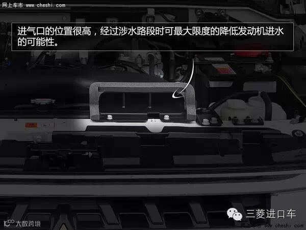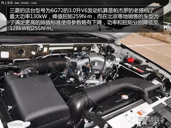 三菱的这台型号为6G72的3.0升V6发动机算是帕杰罗的老搭档了,最大功率130kW,峰值扭矩259N•m,而在北京等地销售的车型为了满足更高的排放标准使得参数略有下降,功率和扭矩分别降低至128kW和255N•m。值得一提的是帕杰罗的发动机进气口位置很高,经过涉水路段时可最大限度的降低发动机进水的可能性。