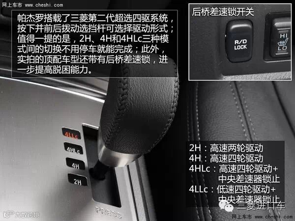 与发动机匹配的是一台5速手自一体变速箱,这台变速箱显然不是靠着技术先进取胜,较高的可靠性才是他的优势所在。帕杰罗搭载了三菱第二代超选四驱系统,按下并前后拨动选挡杆可选择驱动形式;值得一提的是,2H、4H和4HLc三种模式间的切换不用停车(控制时速在100km/h以内)就能完成;此外,实拍的顶配车型还带有后桥差速锁,进一步提高脱困能力。