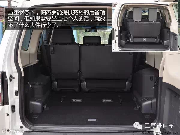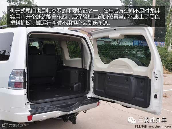 五座状态下,帕杰罗能提供充裕的后备箱空间,但如果需要坐上七个人的话,就放不了什么大件行李了。侧开式尾门也是帕杰罗的重要特征之一,在车后方空间不足时尤其实用,开个缝就能拿东西;后保险杠上部的位置全都包裹上了黑色塑料护板,搬运行李时不用担心会划伤车漆。