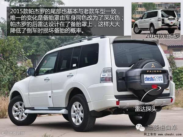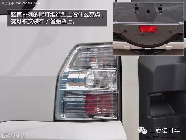 2015款帕杰罗的尾部也基本与老款车型一致,唯一的变化是备胎罩由车身同色改为了深灰色;帕杰罗的后雷达设计在了备胎罩上,这样大大降低了倒车时损坏备胎的概率。竖直排列的尾灯组造型上没什么亮点,雾灯被安装在了备胎罩上。