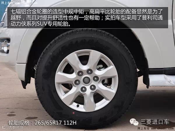 大面积镀铬的门把手和后视镜算是帕杰罗的家族特色;七辐铝合金轮圈的造型中规中矩,高扁平比轮胎的配备显然是为了越野,而且对提升舒适性也有一定帮助;实拍车型采用了普利司通动力侠系列SUV专用轮胎。