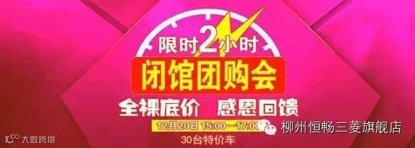 三菱娱乐讯:由广西三菱旗舰店——柳州恒畅出品,白马汽车集团导演及监制的最“丰”活动《全裸底价 感恩回馈——SUV世家大型闭馆团购会》即将于 12月20-21日每天下午3点在柳州汽贸园三菱展厅准时开抢。
