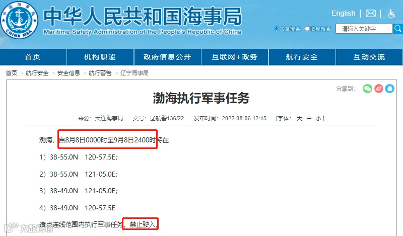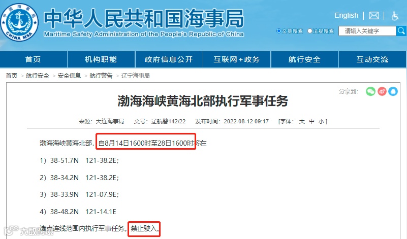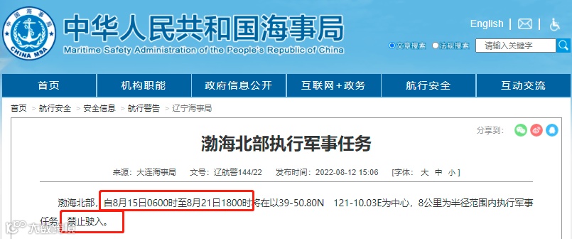 据大连海事局消息:辽航警144/22 渤海北部,自8月15日0600时至8月21日1800时,将在以39-50.80N 121-10.03E为中心,8公里为半径范围内执行军事任务。禁止驶入。