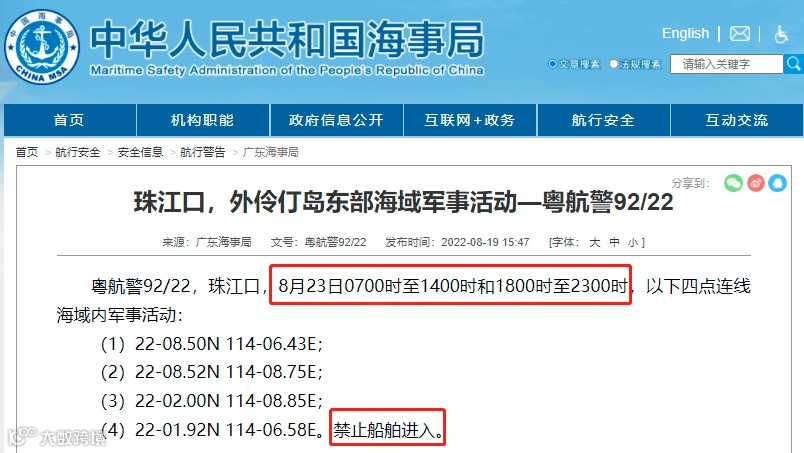 据广东海事局消息:粤航警92/22 珠江口,8月23日0700时至1400时和1800时至2300时,将在以下四点连线海域内军事活动: