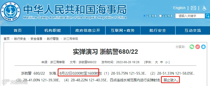 据浙江海事局消息:浙航警680/22 东海,8月22日0200时至1600时将在: