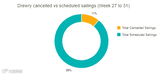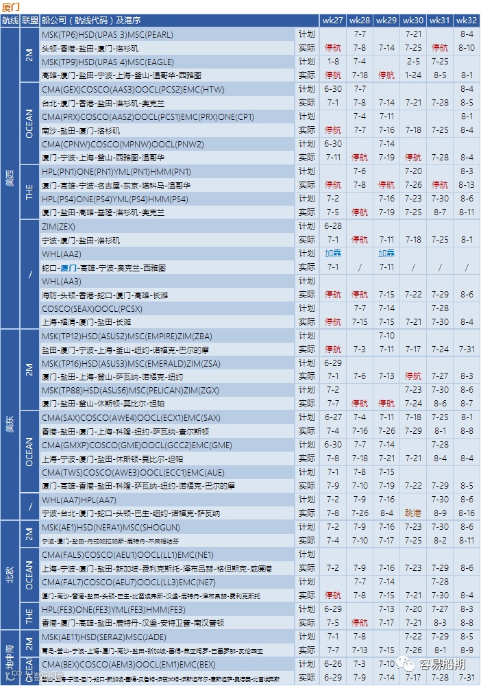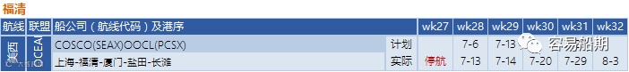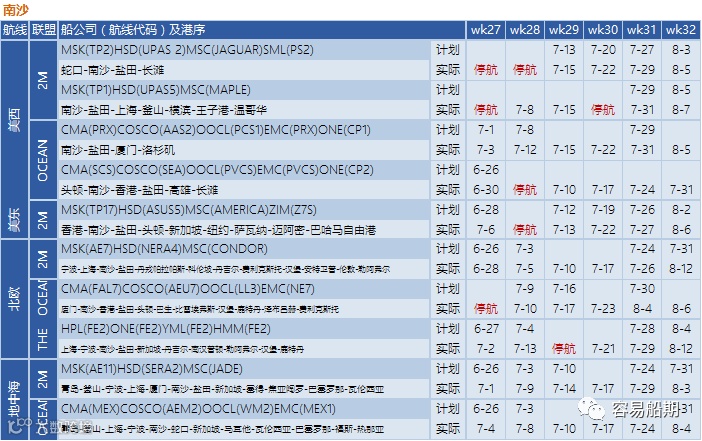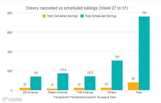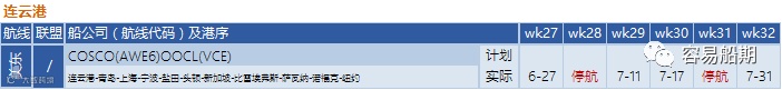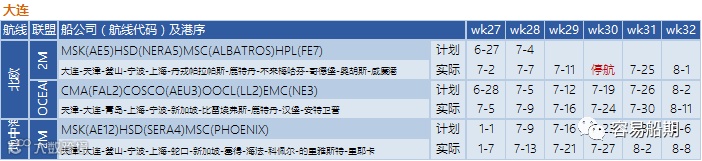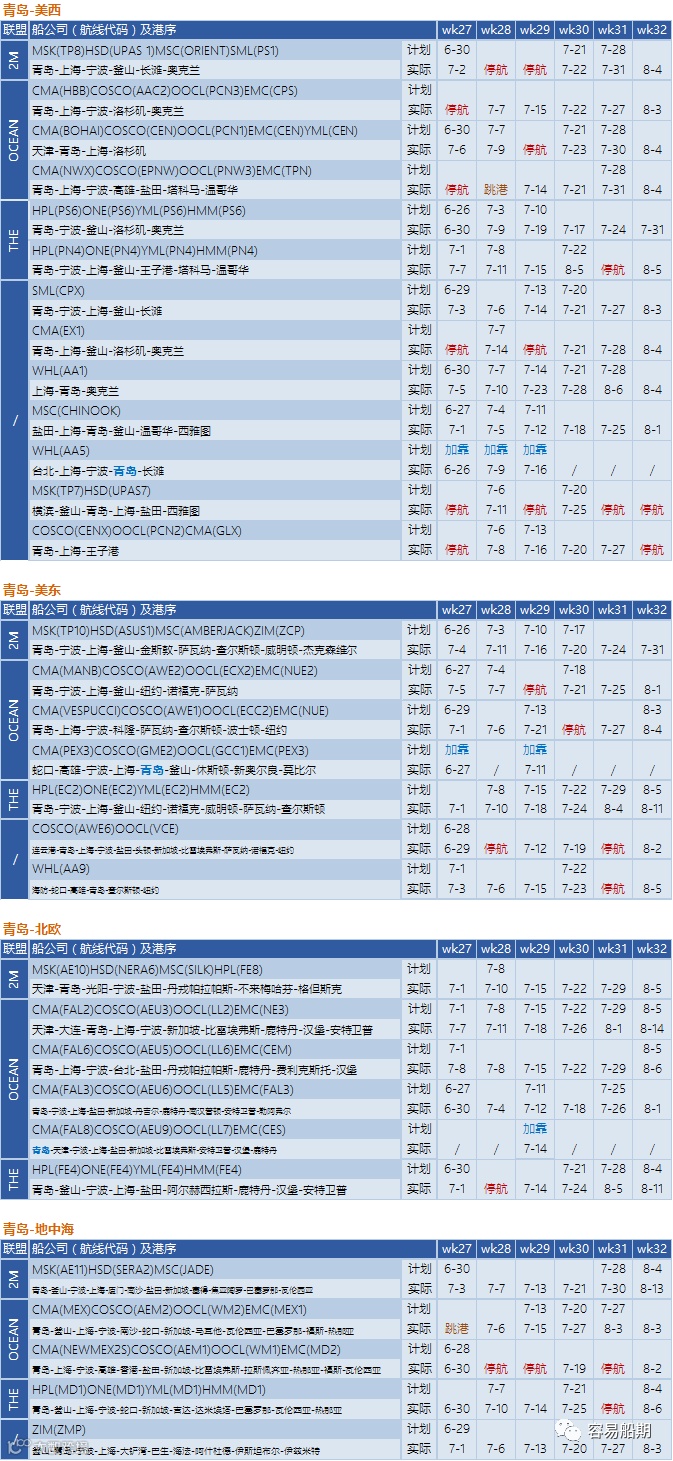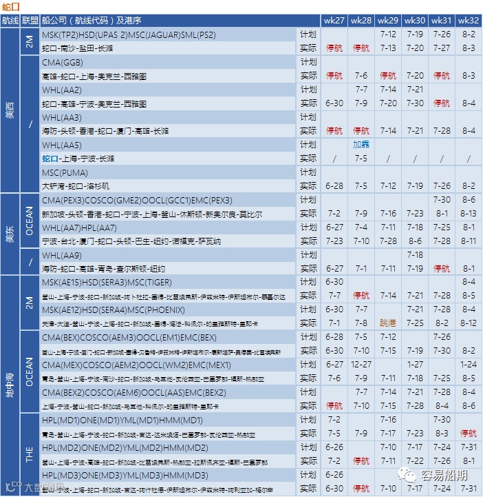 根据容易船期统计的数据,与2021年6-7月数据相比,2022年6-7月停航总数约为去年3倍。从停航数占计划航次的比重不难看出,与去年相比,计划航次在增加,停航比重也在上升。从区域看,美西停航比重增加较多。从联盟来看,除2M外停航比重均有10%左右的增加。