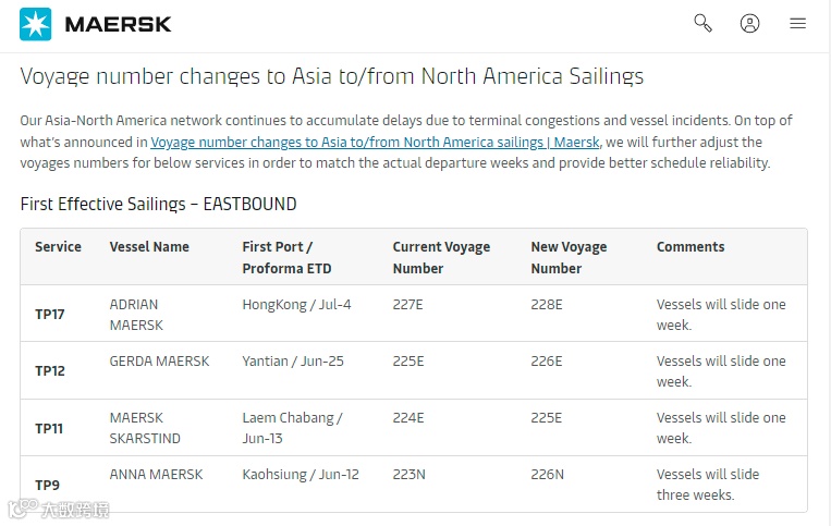 网络继续造成累积性延误。马士基宣布调整亚洲往返北美服务的航次!以匹配实际出发周数并提供更好的船期可靠性。