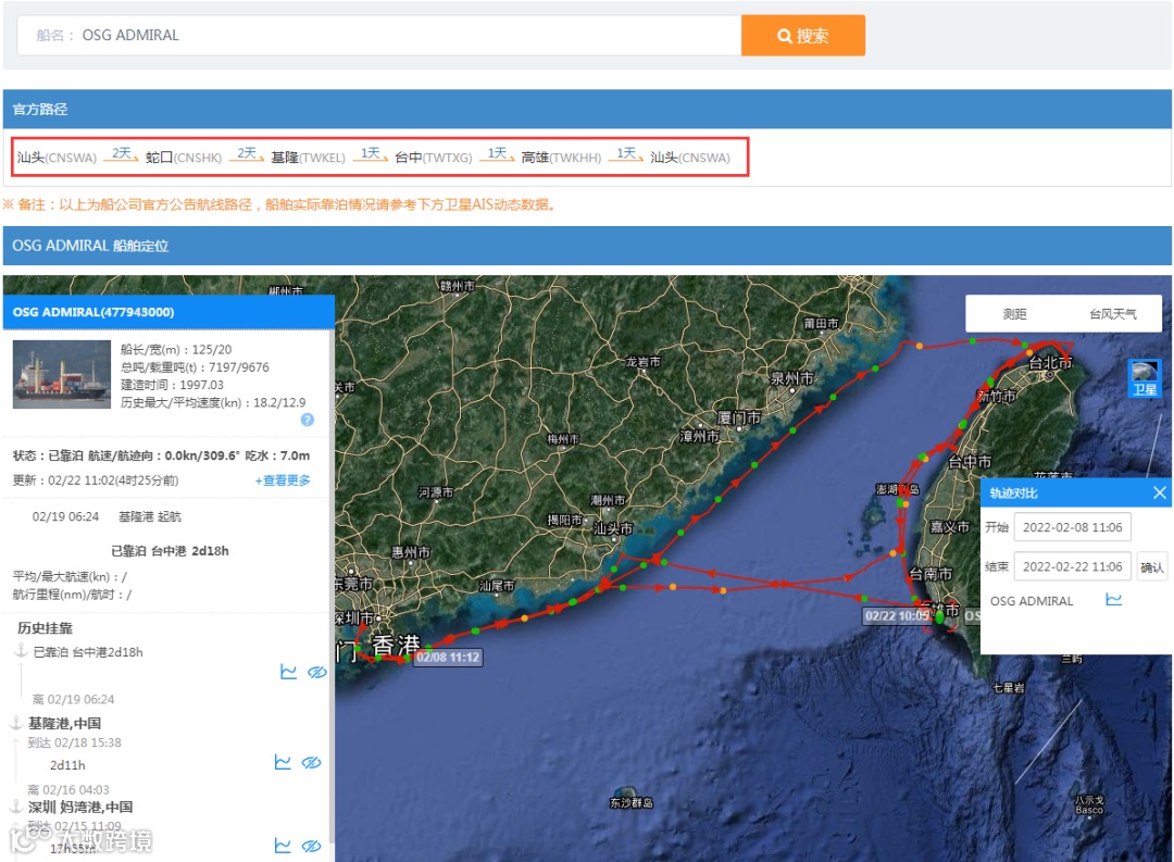据了解,涉事集装箱船“OSG Admiral”,IMO: 9131022,建造于1997年,悬挂香港旗帜。正在执行2205E航次服务,属于中联航运SCT3航线。从国内蛇口、汕头等装满货柜开往中国台湾基隆、台中、高雄港。共舱的船公司有中联航运、德翔、万海等。