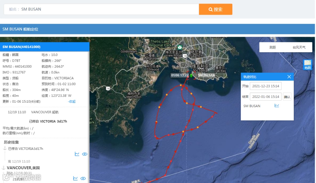 最新数据,截止目前,该船仍位于加拿大维多利亚,处于靠泊状态,预计原定船期将延误。