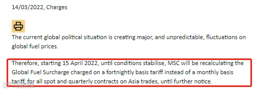 地中海航运公司(MSC)成为第一家对其面临的极度波动的燃油费用采取措施的班轮公司,14日,MSC宣布将从下个月中旬开始,对所有亚洲贸易现货和季度合同的燃油附加费进行两周一次的审查,而不是每月一次的审查。
