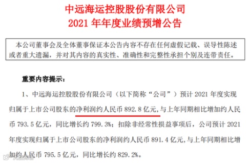 1月24日晚间,集运龙头中远海控发布业绩预告,公司预计2021年净利约893亿元,同比增约8倍,约合每日净赚2.4亿元。这将是公司历史上年度最佳业绩。