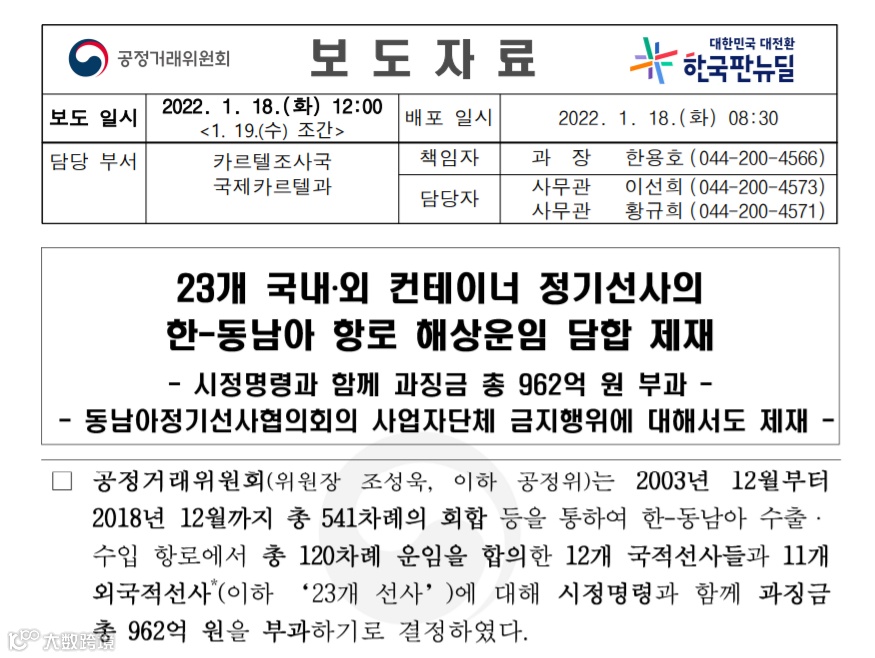 1月18日消息,韩国公正交易委员会周二在官网发布公告称,认定23家国内外海运企业涉嫌在长达15年的时间里串通上调韩国至东南亚线路出口航线的最低运费,据此作出合计962亿韩元(约合5.12亿元人民币)的处罚。