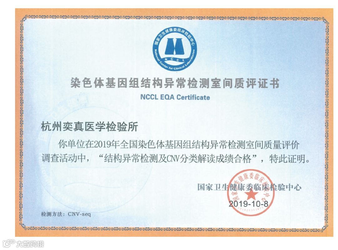 近日,国家卫生健康委临床检验中心 (National Center for Clinical Laboratories,NCCL) 公布了《2019年全国染色体基因组结构异常检测室间质量评价》调查活动结果,杭州奕真医学检验所通过此次测评并获得证书。