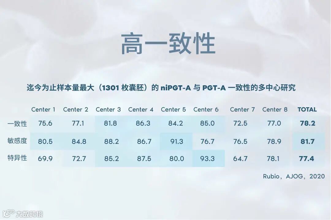 结果显示无创 PGT-A(niPGT-A)与滋养层细胞活检传统方法的一致性达 78.2% (Multicenter prospective study of concordance between embryo cell-free DNA and trophectoderm biopsies from 1,301 human blastocysts,DOI: 10.1016/j.ajog.2020.04.035 )。