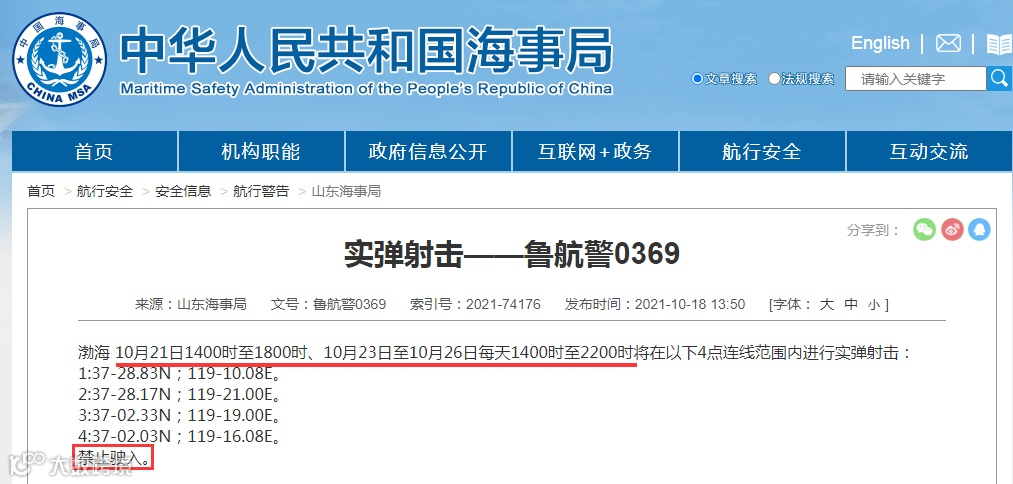 据山东海事局消息:渤海 10月21日1400时至1800时、10月23日至10月26日每天1400时至2200时将在以下4点连线范围内进行实弹射击: