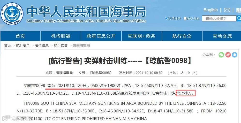 据海宁海事局消息:南海 2021年10月20日,0500时至1900时,在