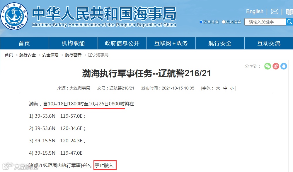 据大连海事局消息:渤海海峡黄海北部,自10月17日1600时至10月31日1600时将在