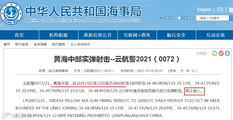 据连云港海事局消息:黄海中部,自10月19日至22日每天0800时至1800时在