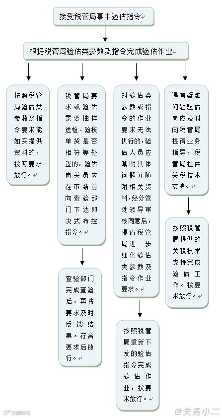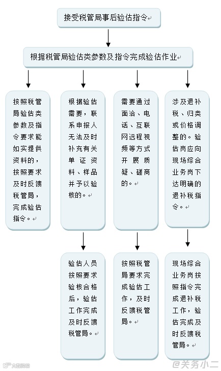 税管局对放行后报关单进行税收风险研判时,需验估岗收集有关单证资料、验核报验状态或开展质疑、磋商的,向验估岗下达事后验估指令。