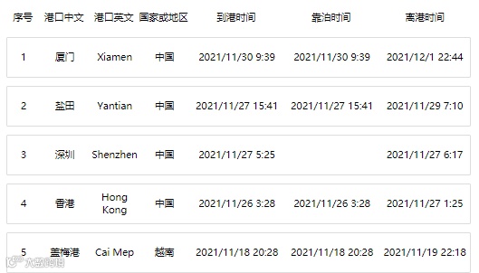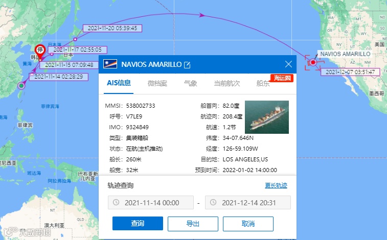 4250TEU的“Navios Amarillo”号于11月17日离开韩国釜山港,目前停泊在墨西哥水域,计划于1月2日停泊在洛杉矶,为期46天。