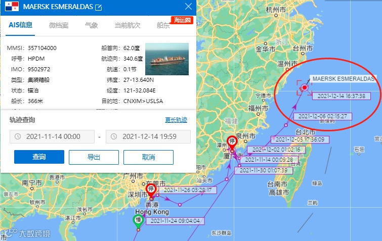 这艘11月底曾挂靠香港、深圳、盐田、厦门港的13000标准箱的“Maersk Esmeraldas”号于两天前离开厦门港(实际上12月1日已离港),目前仍停泊在离中国海岸线不远的海域,计划于1月11日抵达洛杉矶,需要一个月的中转时间,这表明了跨太平洋航线上的拥堵规模。