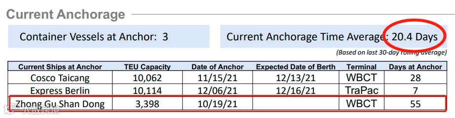 根据南加州海洋交易所(Marine Exchange of Southern California)的最新数据,在绵延1000英里的北美海岸线上,有101艘集装箱船停泊或游荡在美国的两个门户航道上等待泊位。在疫情之前,从亚洲到北美通常只需要两周的航程的船只现在由于拥堵延误却占用了巨大的运力,有些航程船舶的靠泊时间超过了45天。“中谷山东”号等待泊位已达55天。
