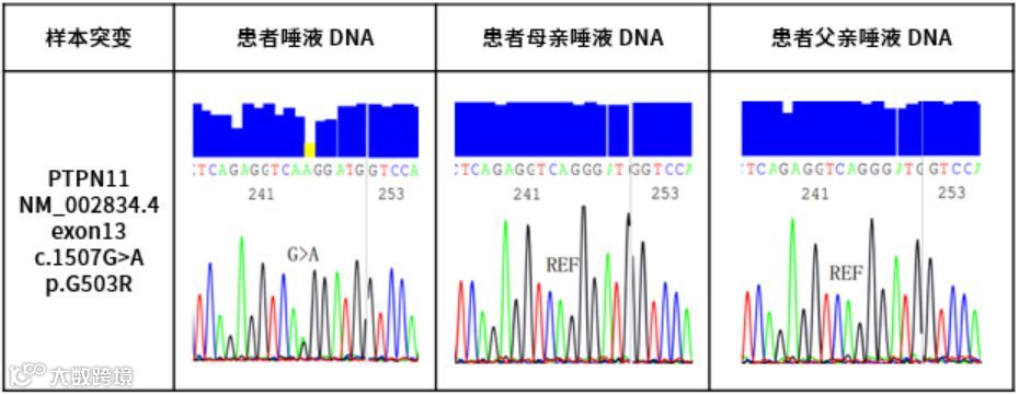 ClinVar 将该变异定义为致病性变异。为了明确该变异的遗传来源,我们对患者及其父母的唾液样本进行了 Sanger 验证,发现除了患者的唾液 DNA 中检出了 PTPN11 c.1507G>A (p.G503R) 错义突变,其父母唾液 DNA 中均未检出相同变异,这说明该变异为新生突变(De novo)。