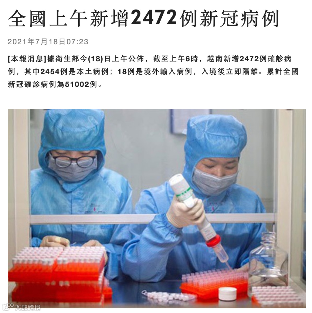 据越南卫生部18日公布,截至上午6时,越南新增2472例确诊病例,其中2454例是本土病例;18例是境外输入病例,入境后立即隔离。这两千多确诊病例中,仅胡志明市就有1756例。目前,越南全国新冠确诊病例累计51002例。