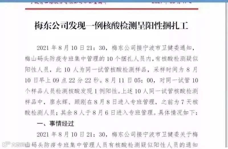 2021年8月11日凌晨5点,梅山码头防疫专班集中管理的10个捆扎人员内,有一例核酸检测结果呈阳性。