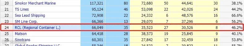 RCL是全球第24大班轮运营商,拥有27艘自有船和8艘租赁船,运力为66049标准箱。